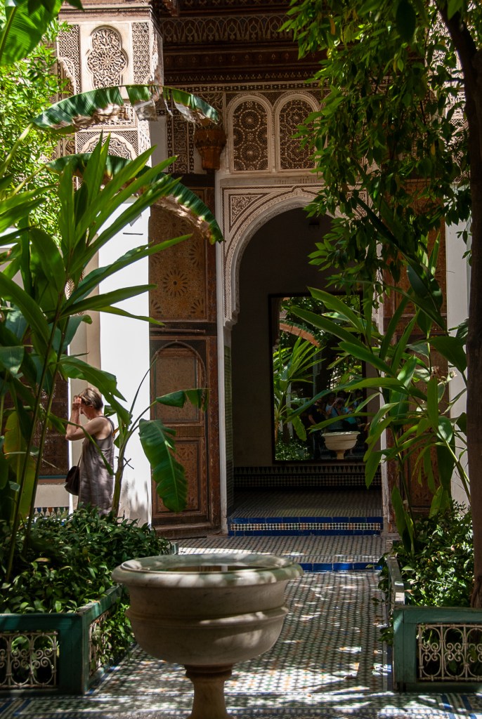 It was a beautful Sunday in June 2012. Al, Eric, Ellen and I were in Marrakech and planned to visit a few of the historical sites in the city, including the Palais de la Bahia and the Palais el Badi. The former was built in the nineteenth century and was intended to be the greatest palace of all time. Its name means “Brilliance” and the palace is still sometimes used for official functions. The Palais el Badi, which means “Incomparable” was originally built in the sixteenth century but was looted when Sultan Moulay Ismail decided to move his wealth to the city of Meknes. It is now being excavated and, at some level, restored. In any case, they both promised to give us glimpses and insights into Moroccan architecture and culture, and according to the employees of our hotel, the Riad Princesse Jamila, both were within an easy 5 minute walk.